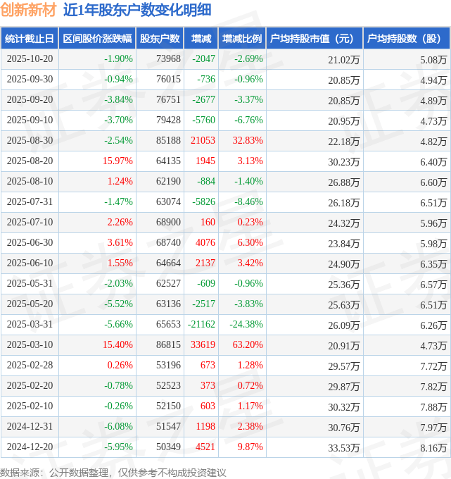 从股价来看,2025年9月30日至2025年10月20日,创新新材区间跌幅为1.9%,在此期间股东户数减少2047.0户,减幅为2.69%。