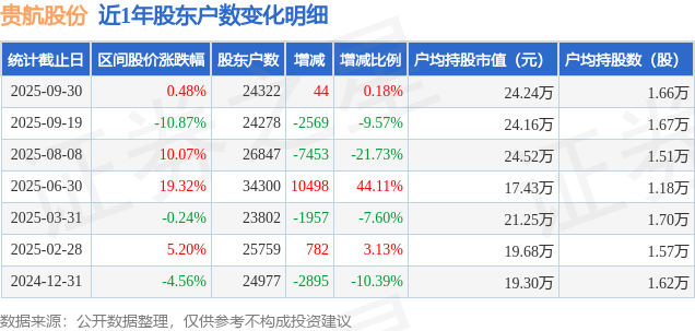 从股价来看,2025年9月19日至2025年9月30日,贵航股份区间涨幅为0.48%,在此期间股东户数增加44.0户,增幅为0.18%。
