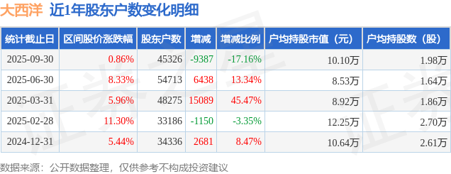 从股价来看,2025年6月30日至2025年9月30日,大西洋区间涨幅为0.86%,在此期间股东户数减少9387.0户,减幅为17.16%。