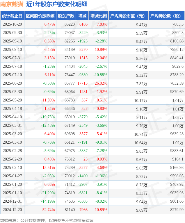 从股价来看,2025年9月30日至2025年10月20日,南京熊猫区间涨幅为6.47%,在此期间股东户数增加6186.0户,增幅为7.83%。