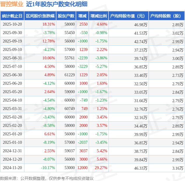 从股价来看,2025年9月30日至2025年10月20日,晋控煤业区间涨幅为18.31%,在此期间股东户数增加2550.0户,增幅为4.6%。