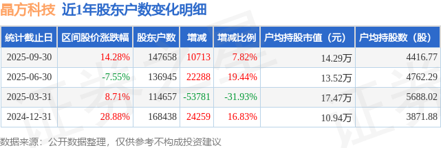 证券之星消息,近日晶方科技披露,截至2025年9月30日公司股东户数为14.77万户,较6月30日增加1.07万户,增幅为7.82%。户均持股数量由上期的4762.0股减少至4417.0股,户均持股市值为14.29万元。