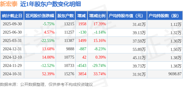 从股价来看,2025年6月30日至2025年9月30日,新宏泰区间跌幅为5.75%,在此期间股东户数增加1958.0户,增幅为17.39%。