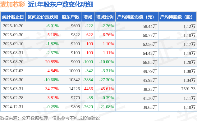 从股价来看,2025年9月30日至2025年10月20日,麦加芯彩区间跌幅为6.01%,在此期间股东户数减少222.0户,减幅为2.26%。