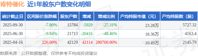 从股价来看,2025年6月30日至2025年9月30日,肯特催化区间跌幅为7.8%,在此期间股东户数减少5929.0户,减幅为27.31%。