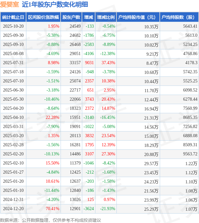从股价来看,2025年9月30日至2025年10月20日,爱婴室区间涨幅为1.95%,在此期间股东户数减少133.0户,减幅为0.54%。
