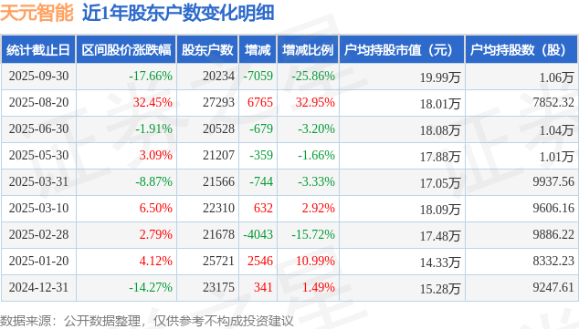 从股价来看,2025年8月20日至2025年9月30日,天元智能区间跌幅为17.66%,在此期间股东户数减少7059.0户,减幅为25.86%。