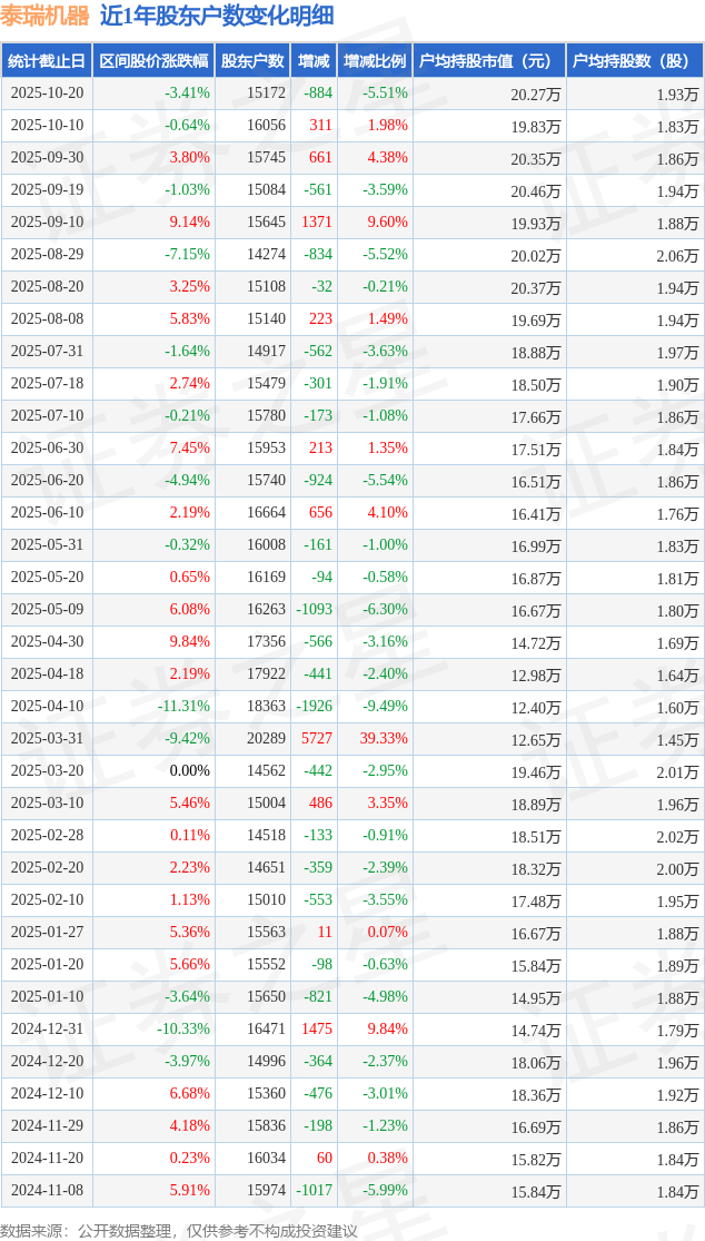 从股价来看,2025年10月10日至2025年10月20日,泰瑞机器区间跌幅为3.41%,在此期间股东户数减少884.0户,减幅为5.51%。