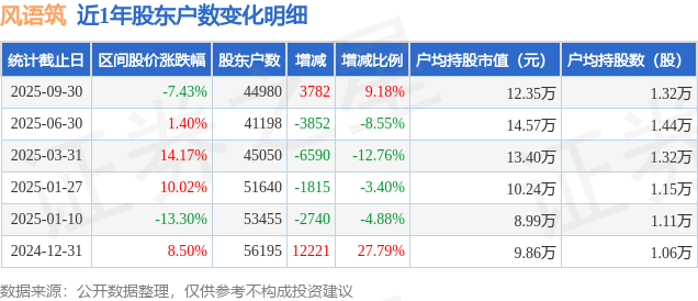 从股价来看,2025年6月30日至2025年9月30日,风语筑区间跌幅为7.43%,在此期间股东户数增加3782.0户,增幅为9.18%。