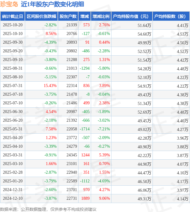 从股价来看,2025年10月10日至2025年10月20日,珍宝岛区间跌幅为2.82%,在此期间股东户数增加573.0户,增幅为2.76%。