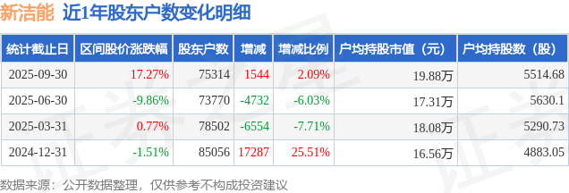 从股价来看,2025年6月30日至2025年9月30日,新洁能区间涨幅为17.27%,在此期间股东户数增加1544.0户,增幅为2.09%。