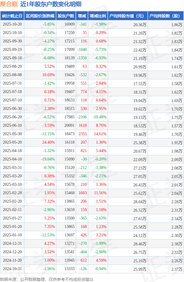 从股价来看,2025年10月10日至2025年10月20日,聚合顺区间跌幅为5.85%,在此期间股东户数减少341.0户,减幅为1.98%。