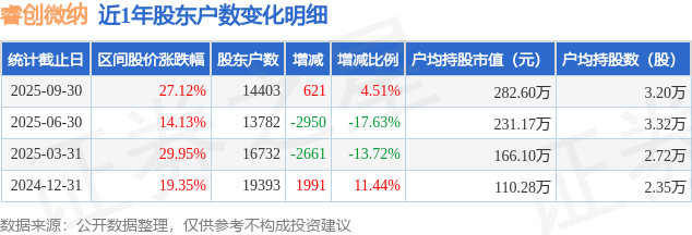 从股价来看,2025年6月30日至2025年9月30日,睿创微纳区间涨幅为27.12%,在此期间股东户数增加621.0户,增幅为4.51%。