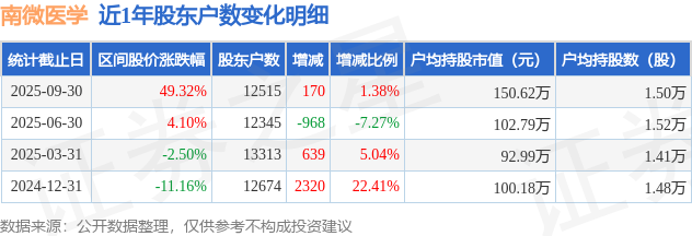从股价来看,2025年6月30日至2025年9月30日,南微医学区间涨幅为49.32%,在此期间股东户数增加170.0户,增幅为1.38%。