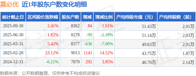 从股价来看,2025年6月30日至2025年9月30日,嘉必优区间涨幅为2.41%,在此期间股东户数增加84.0户,增幅为1.01%。