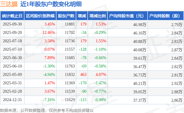 从股价来看,2025年9月20日至2025年9月30日,三达膜区间涨幅为3.45%,在此期间股东户数增加179.0户,增幅为1.53%。