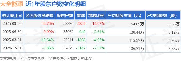 从股价来看,2025年6月30日至2025年9月30日,大全能源区间涨幅为34.76%,在此期间股东户数增加4934.0户,增幅为14.07%。