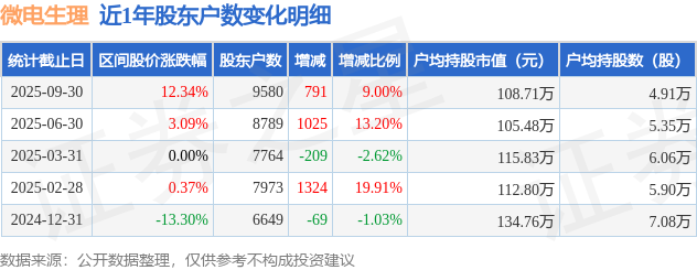 证券之星消息,近日微电生理披露,截至2025年9月30日公司股东户数为9580.0户,较6月30日增加791.0户,增幅为9.0%。户均持股数量由上期的5.35万股减少至4.91万股,户均持股市值为108.71万元。
