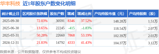 从股价来看,2025年6月30日至2025年9月30日,华丰科技区间涨幅为72.03%,在此期间股东户数增加8346.0户,增幅为37.52%。