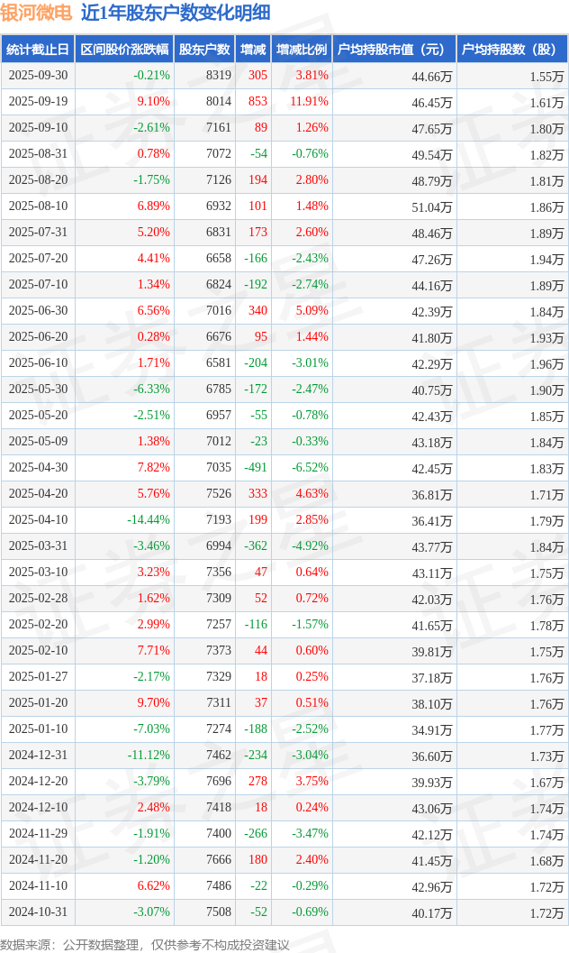 从股价来看,2025年9月19日至2025年9月30日,银河微电区间跌幅为0.21%,在此期间股东户数增加305.0户,增幅为3.81%。