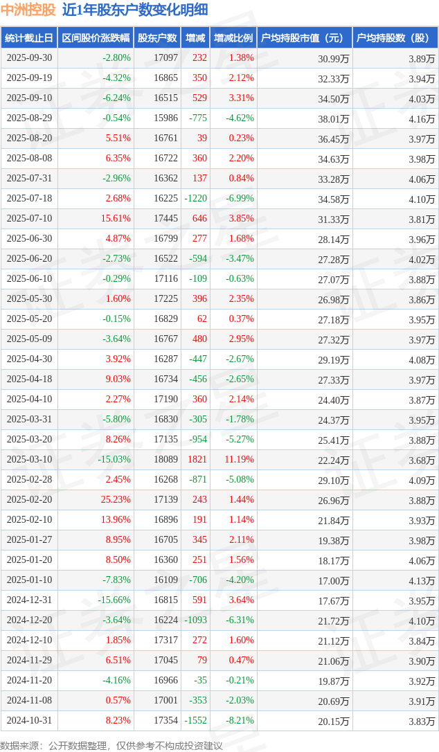 从股价来看,2025年9月19日至2025年9月30日,中洲控股区间跌幅为2.8%,在此期间股东户数增加232.0户,增幅为1.38%。