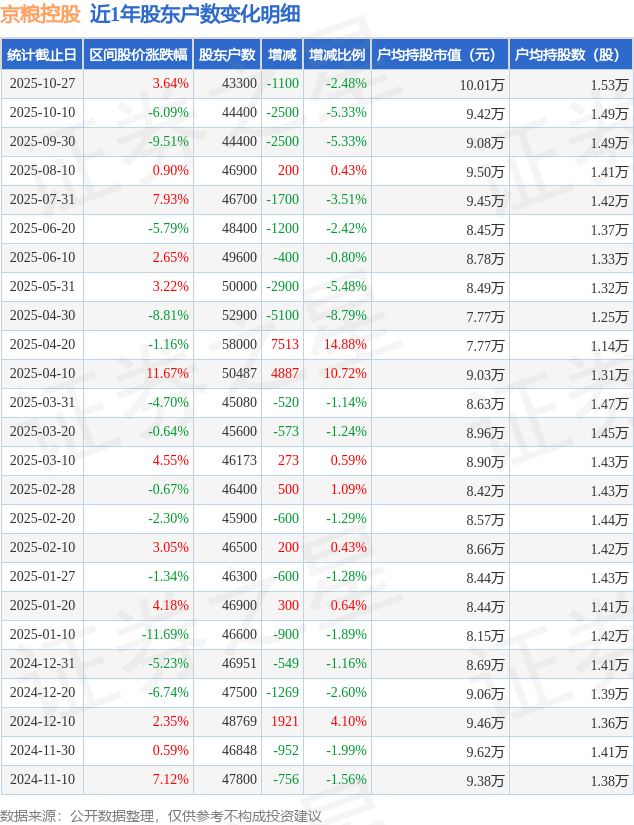 从股价来看,2025年10月10日至2025年10月27日,京粮控股区间涨幅为3.64%,在此期间股东户数减少1100.0户,减幅为2.48%。