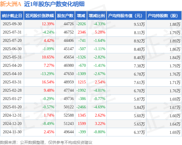 从股价来看,2025年7月31日至2025年9月30日,新大洲A区间涨幅为12.39%,在此期间股东户数减少2026.0户,减幅为4.33%。