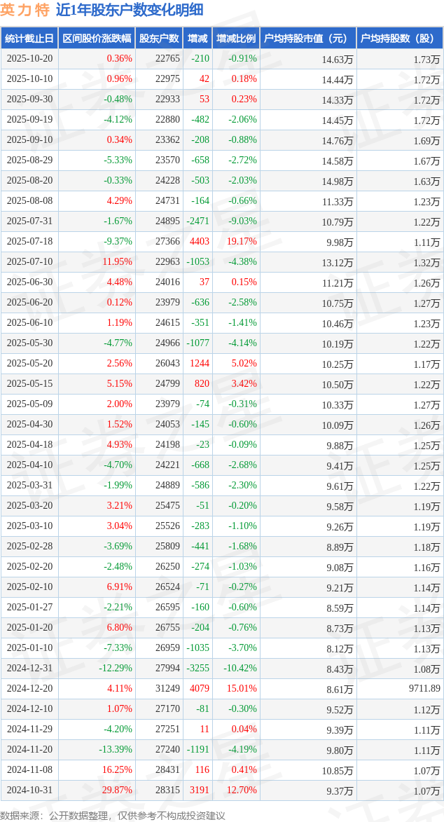 从股价来看,2025年10月10日至2025年10月20日,英 力 特区间涨幅为0.36%,在此期间股东户数减少210.0户,减幅为0.91%。