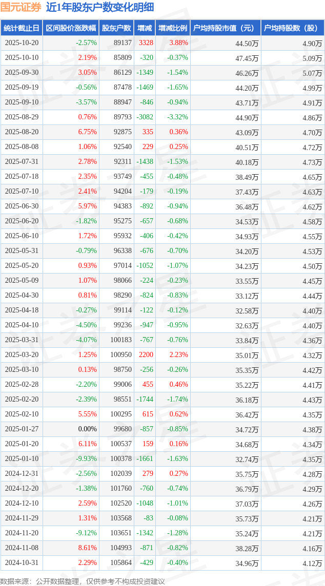 证券之星消息,近日国元证券披露,截至2025年10月20日公司股东户数为8.91万户,较10月10日增加3328.0户,增幅为3.88%。户均持股数量由上期的5.09万股减少至4.9万股,户均持股市值为44.5万元。
