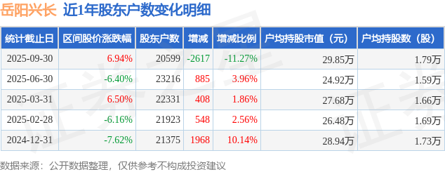 从股价来看,2025年6月30日至2025年9月30日,岳阳兴长区间涨幅为6.94%,在此期间股东户数减少2617.0户,减幅为11.27%。