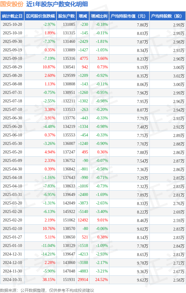 证券之星消息,近日国安股份披露,截至2025年10月20日公司股东户数为13.11万户,较10月10日减少230.0户,减幅为0.18%。户均持股数量由上期的2.99万股增加至2.99万股,户均持股市值为7.8万元。