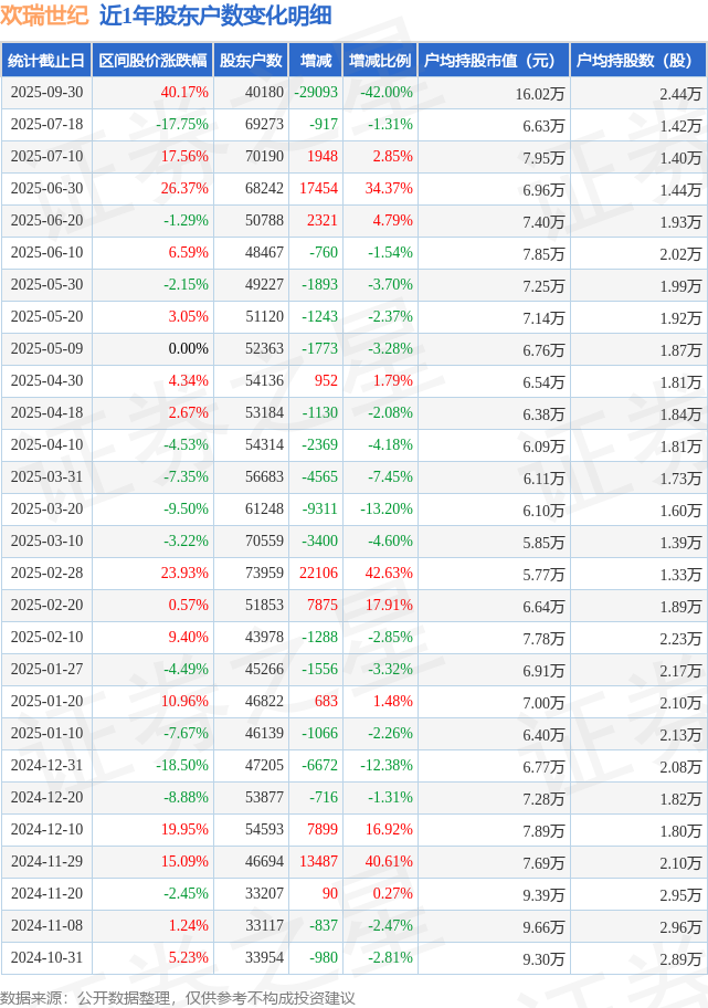 从股价来看,2025年7月18日至2025年9月30日,欢瑞世纪区间涨幅为40.17%,在此期间股东户数减少2.91万户,减幅为42.0%。