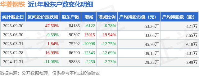 从股价来看,2025年6月30日至2025年9月30日,华菱钢铁区间涨幅为47.5%,在此期间股东户数减少6122.0户,减幅为6.78%。