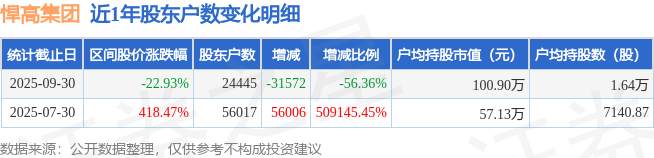 从股价来看,2025年7月30日至2025年9月30日,悍高集团区间跌幅为22.93%,在此期间股东户数减少3.16万户,减幅为56.36%。