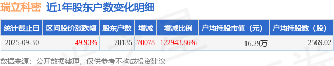 从股价来看,2025年9月11日至2025年9月30日,瑞立科密区间涨幅为49.93%,在此期间股东户数增加7.01万户,增幅为122943.86%。