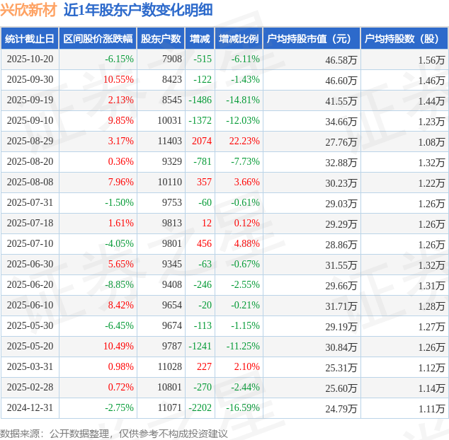 从股价来看,2025年9月30日至2025年10月20日,兴欣新材区间跌幅为6.15%,在此期间股东户数减少515.0户,减幅为6.11%。