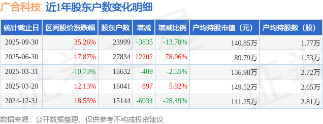 从股价来看,2025年6月30日至2025年9月30日,广合科技区间涨幅为35.26%,在此期间股东户数减少3835.0户,减幅为13.78%。