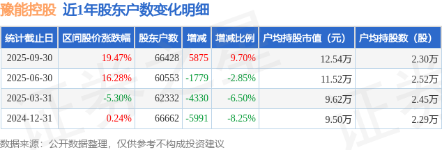 从股价来看,2025年6月30日至2025年9月30日,豫能控股区间涨幅为19.47%,在此期间股东户数增加5875.0户,增幅为9.7%。