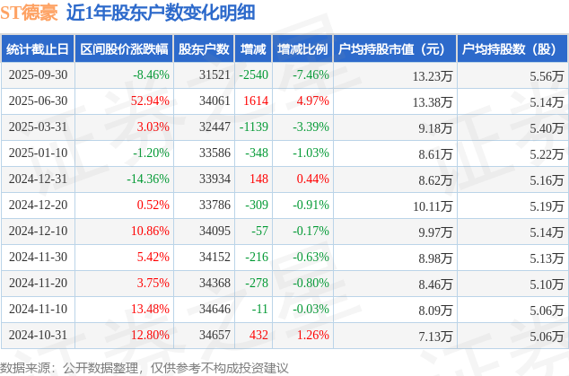从股价来看,2025年6月30日至2025年9月30日,ST德豪区间跌幅为8.46%,在此期间股东户数减少2540.0户,减幅为7.46%。