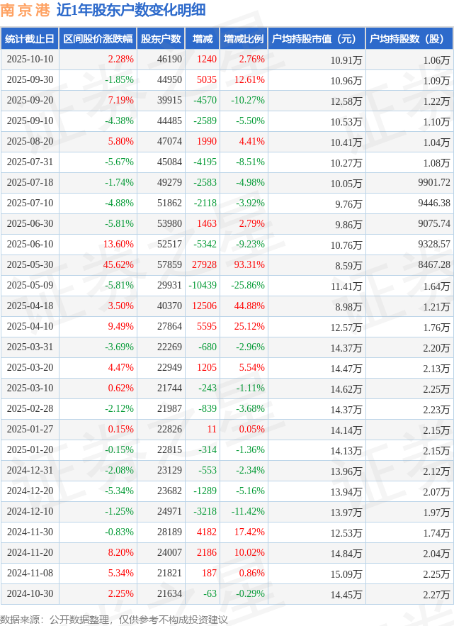 从股价来看,2025年9月30日至2025年10月10日,南 京 港区间涨幅为2.28%,在此期间股东户数增加1240.0户,增幅为2.76%。