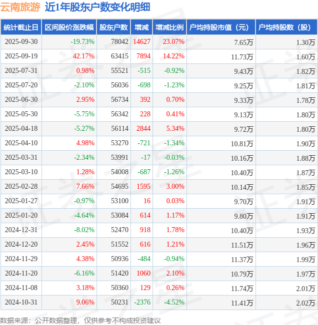 从股价来看,2025年9月19日至2025年9月30日,云南旅游区间跌幅为19.73%,在此期间股东户数增加1.46万户,增幅为23.07%。