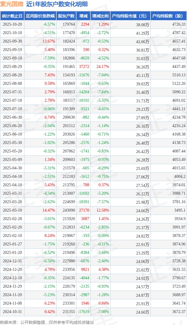 从股价来看,2025年10月10日至2025年10月20日,紫光国微区间跌幅为6.57%,在此期间股东户数增加2294.0户,增幅为1.29%。
