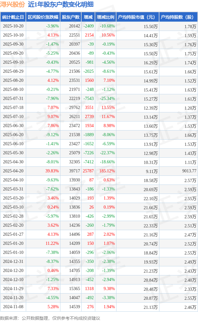 从股价来看,2025年10月10日至2025年10月20日,浔兴股份区间跌幅为3.96%,在此期间股东户数减少2409.0户,减幅为10.68%。