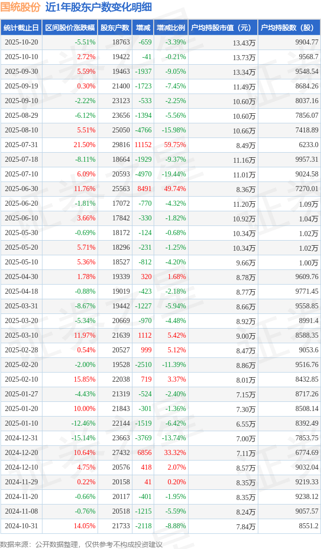 从股价来看,2025年10月10日至2025年10月20日,国统股份区间跌幅为5.51%,在此期间股东户数减少659.0户,减幅为3.39%。