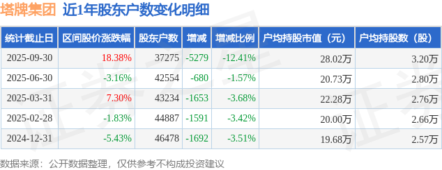 证券之星消息,近日塔牌集团披露,截至2025年9月30日公司股东户数为3.73万户,较6月30日减少5279.0户,减幅为12.41%。户均持股数量由上期的2.8万股增加至3.2万股,户均持股市值为28.02万元。