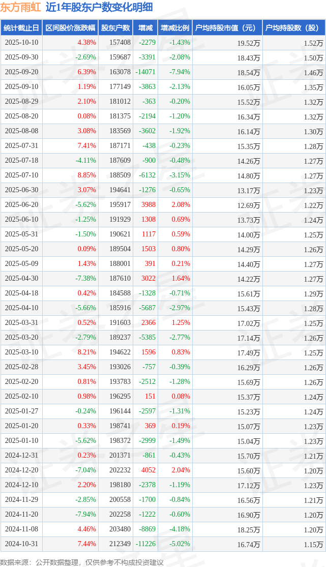 从股价来看,2025年9月30日至2025年10月10日,东方雨虹区间涨幅为4.38%,在此期间股东户数减少2279.0户,减幅为1.43%。