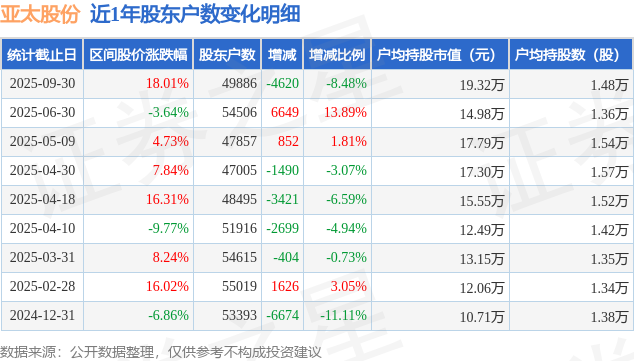 从股价来看,2025年6月30日至2025年9月30日,亚太股份区间涨幅为18.01%,在此期间股东户数减少4620.0户,减幅为8.48%。