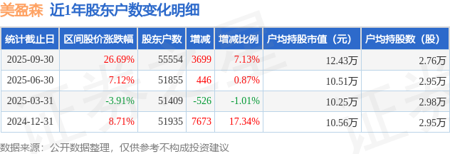 证券之星消息,近日美盈森披露,截至2025年9月30日公司股东户数为5.56万户,较6月30日增加3699.0户,增幅为7.13%。户均持股数量由上期的2.95万股减少至2.76万股,户均持股市值为12.43万元。