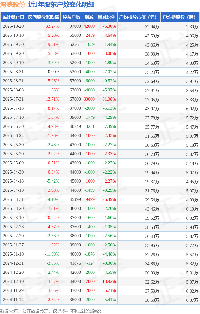 从股价来看,2025年10月10日至2025年10月20日,海峡股份区间涨幅为33.27%,在此期间股东户数增加4.2万户,增幅为76.36%。