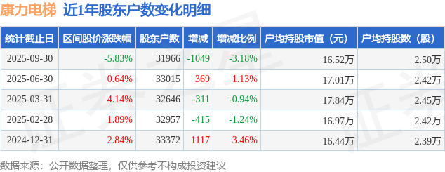 从股价来看,2025年6月30日至2025年9月30日,康力电梯区间跌幅为5.83%,在此期间股东户数减少1049.0户,减幅为3.18%。